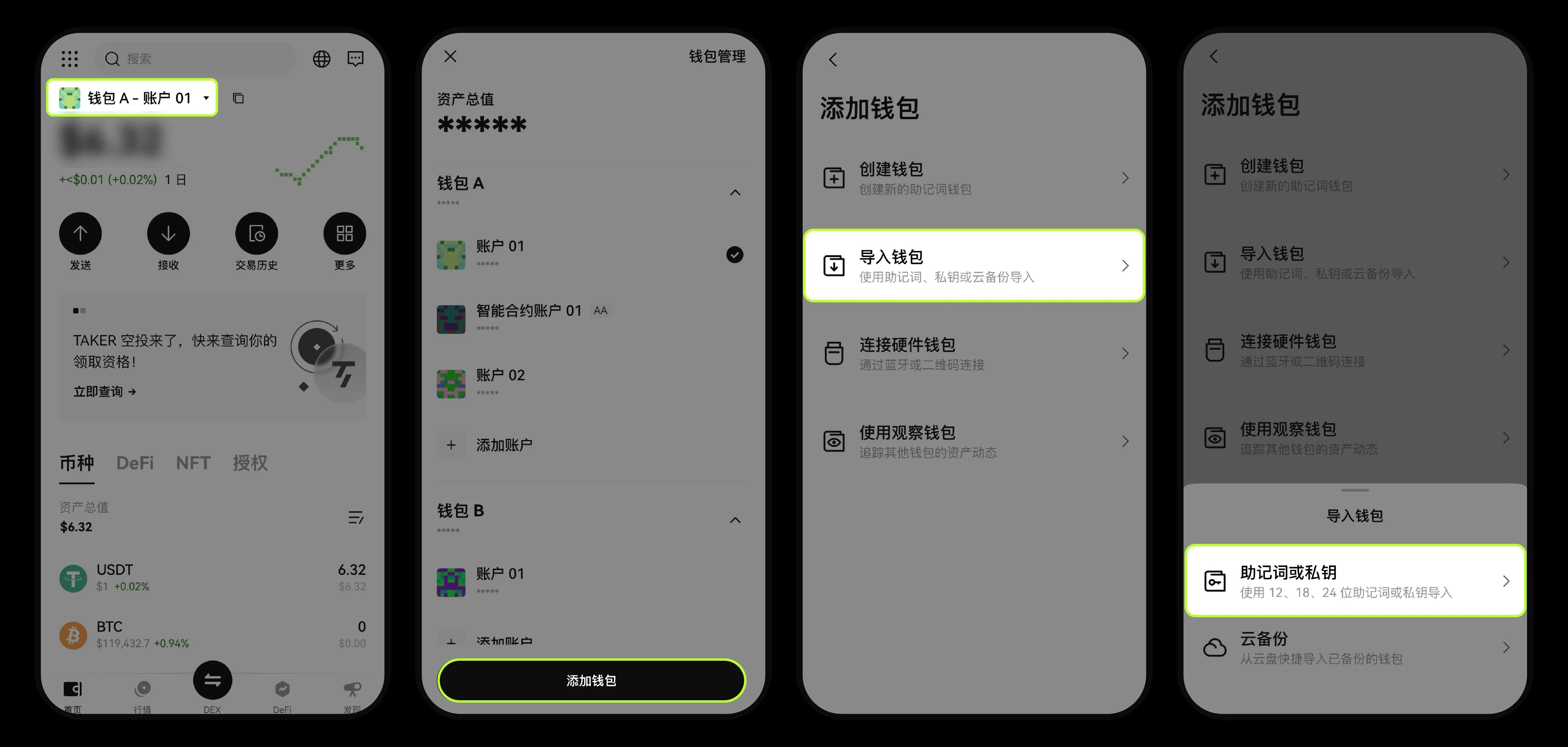 2. 点击【导入钱包】—【助记词或私钥】,按要求完成操作。